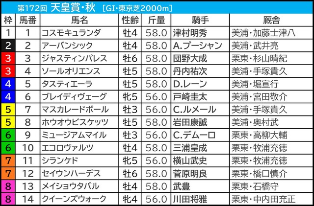 JRAは30日、第172回天皇賞・秋(GI、東京芝2000m)の枠順を発表した。