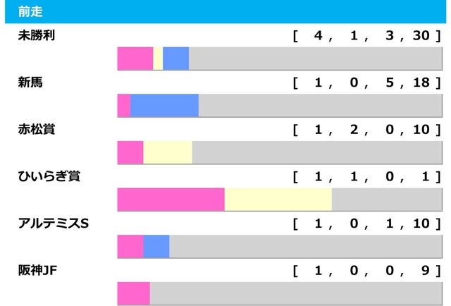 未勝利【4.1.3.30】新馬【1.0.5.18】赤松賞【1.2.0.10】ひいらぎ賞【1.1.0.1】アルテミスS【1.0.1.10】阪神JF【1.0.0.9】京都2歳S【1.0.0.0】黒松賞【0.2.0.2】白菊賞【0.1.0.1】葉牡丹賞【0.1.0.1】1勝クラス【0.1.0.4】サフラン賞【0.1.0.0】京王杯2歳S【0.0.1.3】