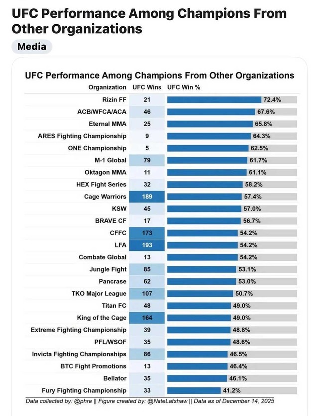 ブラウン氏は2025年12月14日時点のデータをもとに、各団体からUFCに移籍した王者らがどれだけ成功しているかを比較分析した表を掲載。