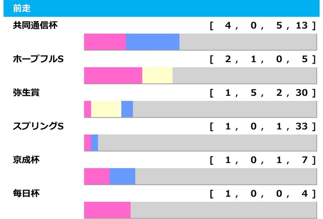 ・共同通信杯【4.0.5.13】・ホープフルS【2.1.0.5】・弥生賞【1.5.2.30】・スプリングS【1.0.1.33】・京成杯【1.0.1.7】・毎日杯【1.0.0.4】・若葉S【0.1.0.18】・朝日杯FS【0.1.0.2】・東スポ杯2歳S【0.1.0.1】・アーリントンC【0.1.0.0】・きさらぎ賞【0.0.1.8】